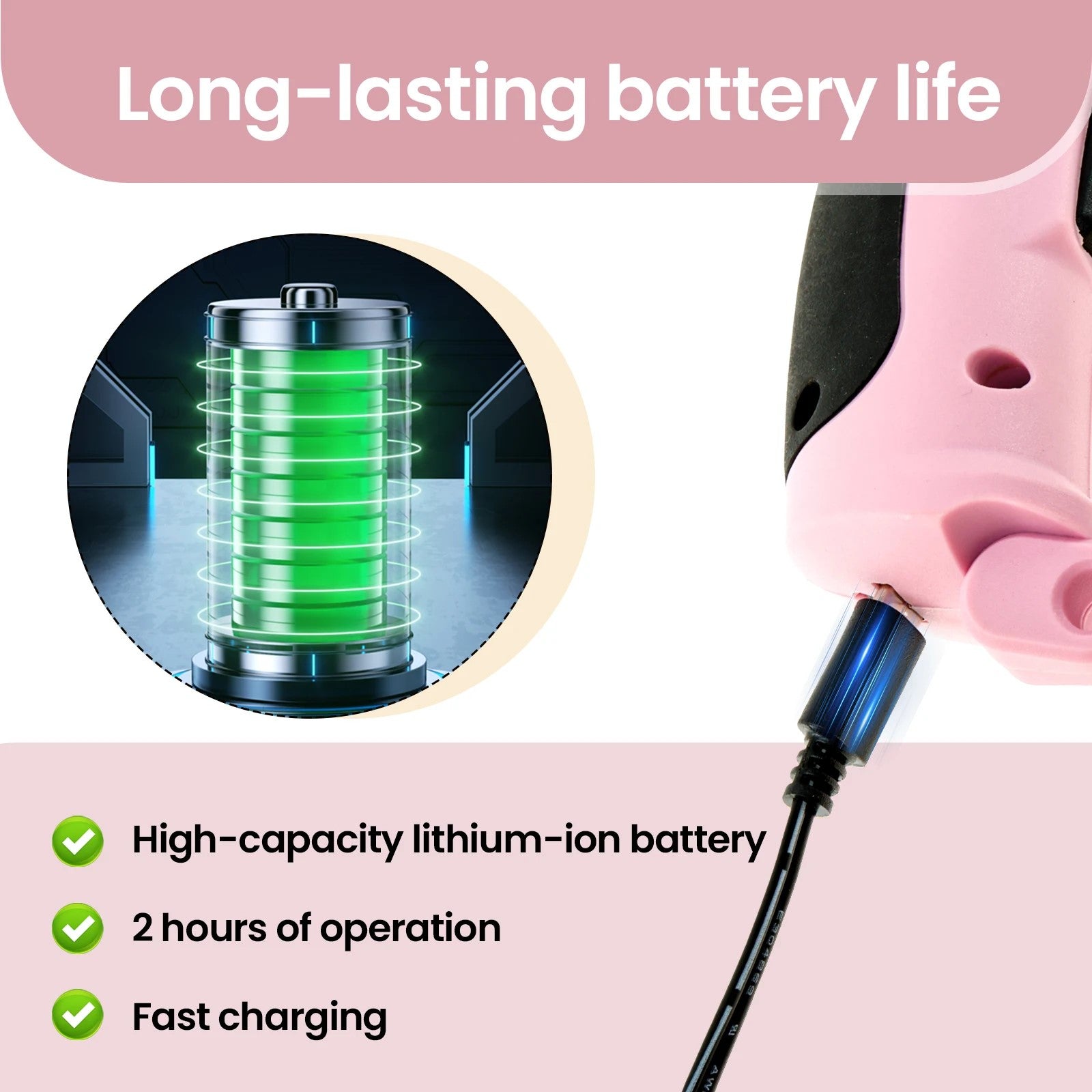 - Power Source: High-capacity lithium-ion rechargeable battery.